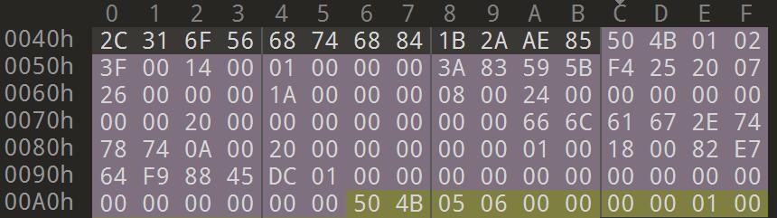 0x50~0x51字节为3F 00,前一个字节表示压缩用的zip版本,这里为6.3,后一个字节表示压缩用的系统类型,以下为常见系统:0MS-DOS / FAT Windows 系统常见(默认),3 UNIX Linux / macOS 常见,7 Macintosh 旧 Mac OS,10 Windows NTFS Windows NT/2000/XP 。